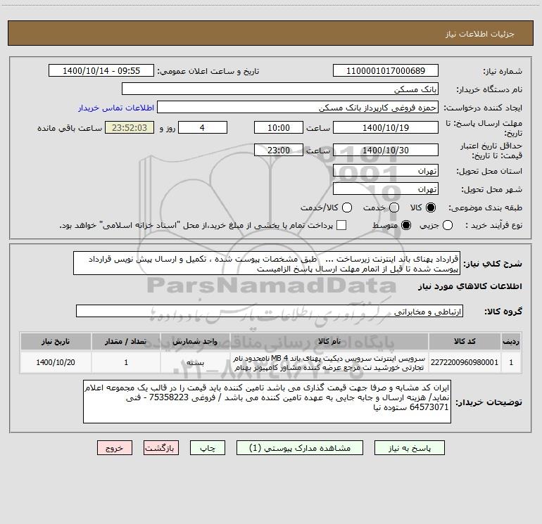 شرح کلی نیاز: قرارداد پهنای باند اینترنت زیرساخت ... طبق مشخصات پیوست شده ، تکمیل و ارسال پیش نویس قرارداد پیوست شده تا قبل از اتمام مهلت ارسال پاسخ الزامیست