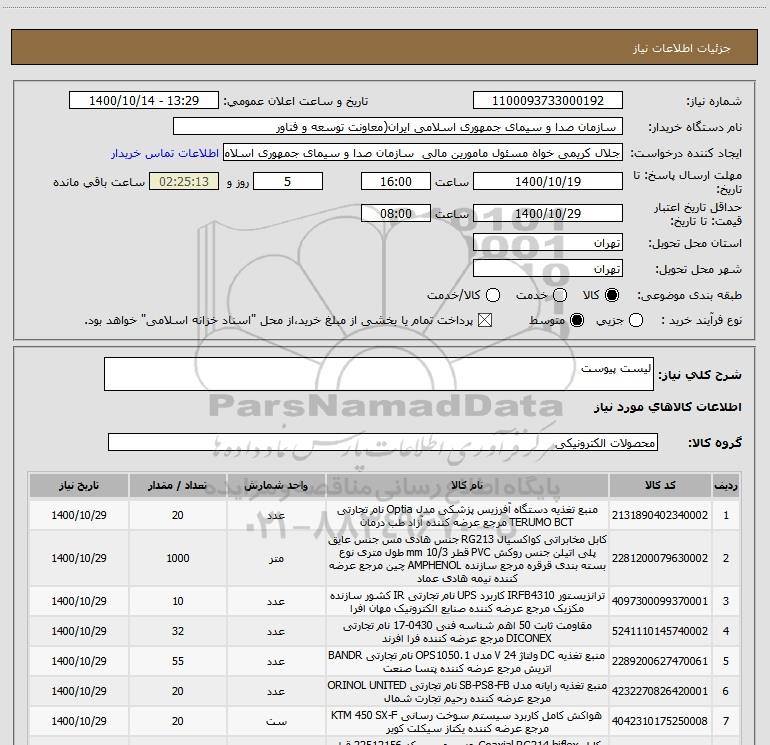 | 1 | 2131890402340002 | منبع تغذیه دستگاه آفرزیس پزشکی مدل Optia نام تجارتی TERUMO BCT مرجع عرضه کننده آزاد طب درمان | عدد | 20 | 1400/10/29 |