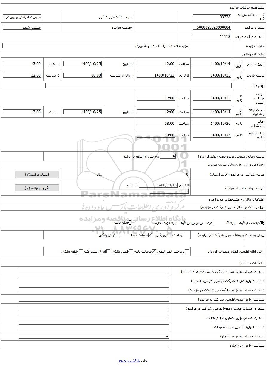 | شماره مورد اجاره | 5100093328000125 | نوع برگزاری مزایده | مزایده عمومی | |