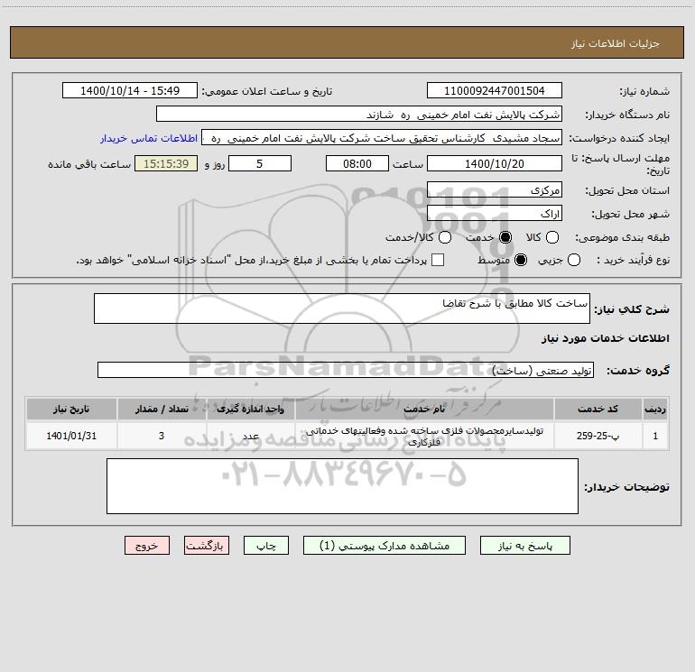 شرح کلی نیاز: ساخت کالا مطابق با شرح تقاضا