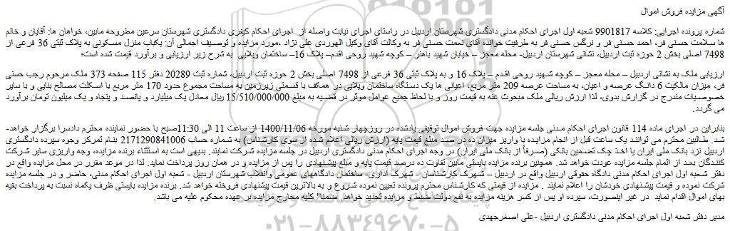 شماره پرونده اجرایی: کلاسه 9901817 شعبه اول اجرای احکام مدنی دادگستری شهرستان اردبیل در راستای اجرای نیابت واصله از اجرای احکام کیفری دادگستری شهرستان سرعین مطروحه مابین، خواهان ها: آقایان و خانم ها سلامت حسنی فر، احمد حسنی فر و نرگس حسنی فر به طرفیت خوانده آقای نعمت حسنی فر به وکالت آقای وکیل الهوردی علی نژاد ،مورد مزایده و توصیف اجمالی آن: یکباب منزل مسکونی به پلاک ثبتی 36 فرعی از 7498 اصلی بخش 2 حوزه ثبت اردبیل، نشانی شهرستان اردبیل- محله معجز – خیابان شهید باهنر – کوچه شهید روحی اقدم– پلاک 16– ساختمان ویلایی به شرح زیر ارزیابی و برآورد قیمت شده است؛