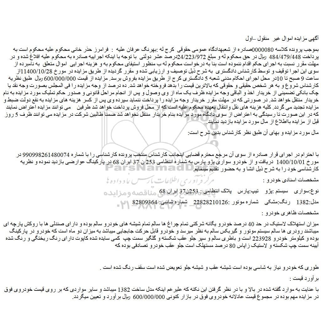 مزایده عمومی مزایده فروش خودرو پژو تیپ:پارس برگزار میگردد. از کلیه افراد متخصص و شرکتهای واجد شرایط دعوت به عمل میآید تا در این مزایده با کد خبرگزاری پارس نماد : 4126351 شرکت نمایند تاریخ شروع مزایده : 1400/10/15 مهلت شرکت در مزایده: تا پایان روز 1400/10/28 مکان برگزاری اموال واگذاری استانهای البرز و دستهبندیهای مربوط به این حراجی انواع خودرو سبک میباشد.