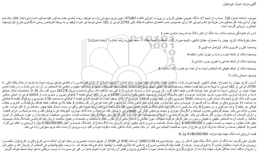 بموجب دادنامه شماره 526 صادره از شعبه 17 دادگاه عمومی حقوقی کرج و در پرونده اجرایی کلاسه 971697 دعوی مریم سهرابی زاده به طرفیت رضا حامدی مقدم محکوم علیه محکوم است به پرداخت 243 سکه تمام بهار آزادی بابت کل محکوم به و هزینه نیم عشراجرایی که دراین خصوص حسب تقاضای محکوم له پلاک ثبتی 23793 فرعی از 162 اصلی توسط این اجراء توقیف و به وسیله کارشناس رسمی دادگستری بشرح ذیل توصیف اجمالی و ارزیابی گردیده است.