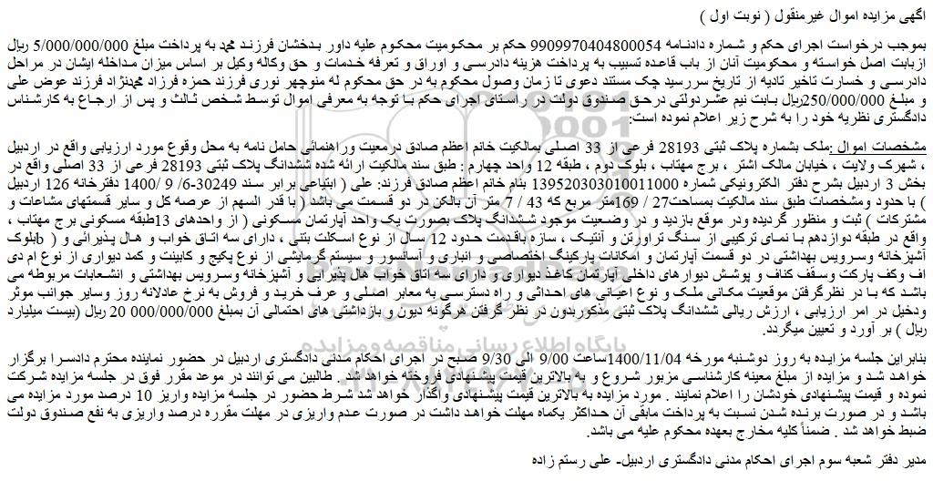 شعبه صادر کننده:شعبه سوم اجرای احکام مدنی دادگستری شهرستان اردبیل