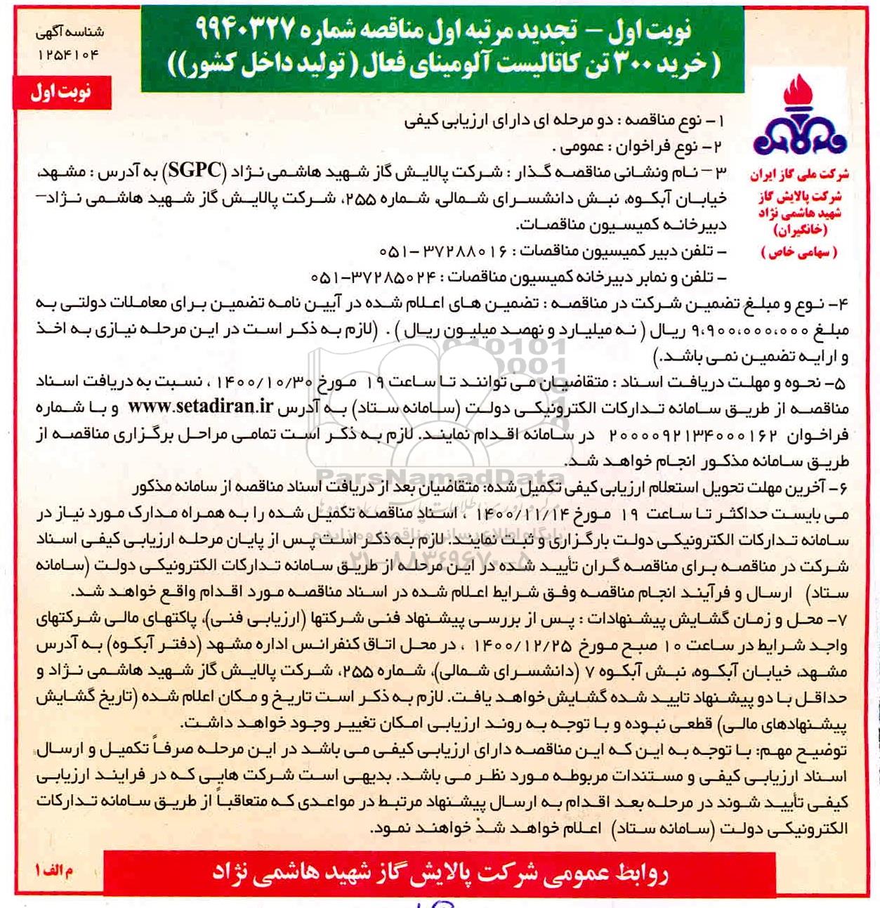 تجدید مناقصه خرید 300 تن کاتالیست آلومینای فعال از کلیه افراد متخصص و شرکتها واجد شرایط دعوت به عمل میآید در مناقصه با کد خبرگزاری پارس نماد: 4127634 شرکت نمایند.