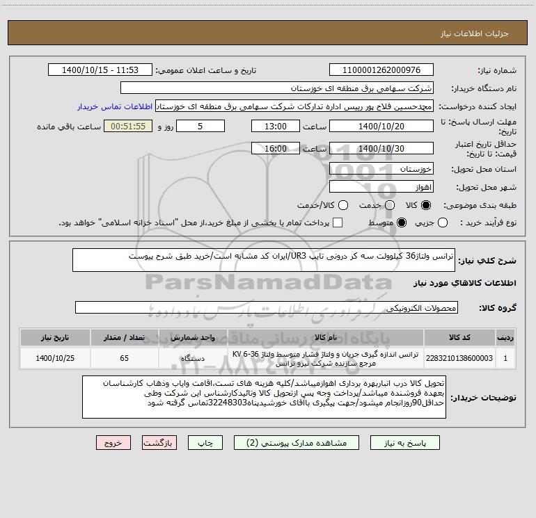 شرح کلی نیاز: ترانس ولتاژ36 کیلوولت سه کر درونی تایپ UR3/ایران کد مشابه است/خرید طبق شرح پیوست
