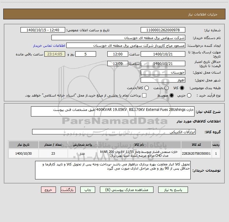 استعلام خازن 400KVAR 19.05KV BIL170KV External Fues 2BUshings طبق مشخصات فنی پیوست , استعلام خازن 400KVAR 19.05KV BIL170KV External Fues 2BUshings طبق مشخصات فنی پیوست