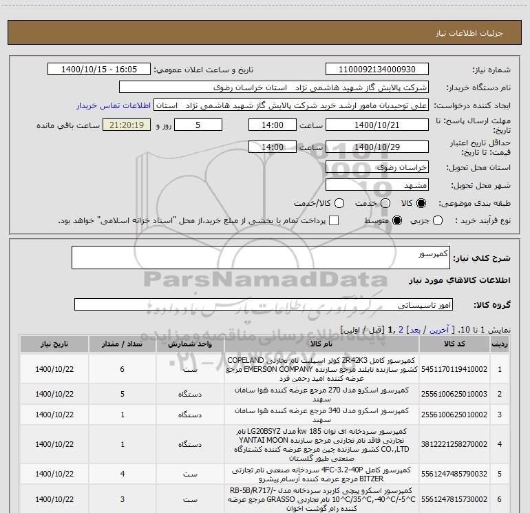 نام دستگاه خریدار:شرکت پالایش گاز شهید هاشمی نژاد استان خراسان رضوی