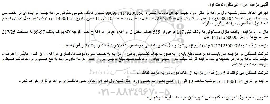 مال مورد مزایده : یکباب منزل مسکونی به پلاک ثبتی 117 فرعی از 535 اصلی بخش 2 مراغه واقع در مراغه خ نصر کوچه لاله پارک پلاک 97-99 به مساحت 217/25 متر مربع به ارزش 14121250000 ریال