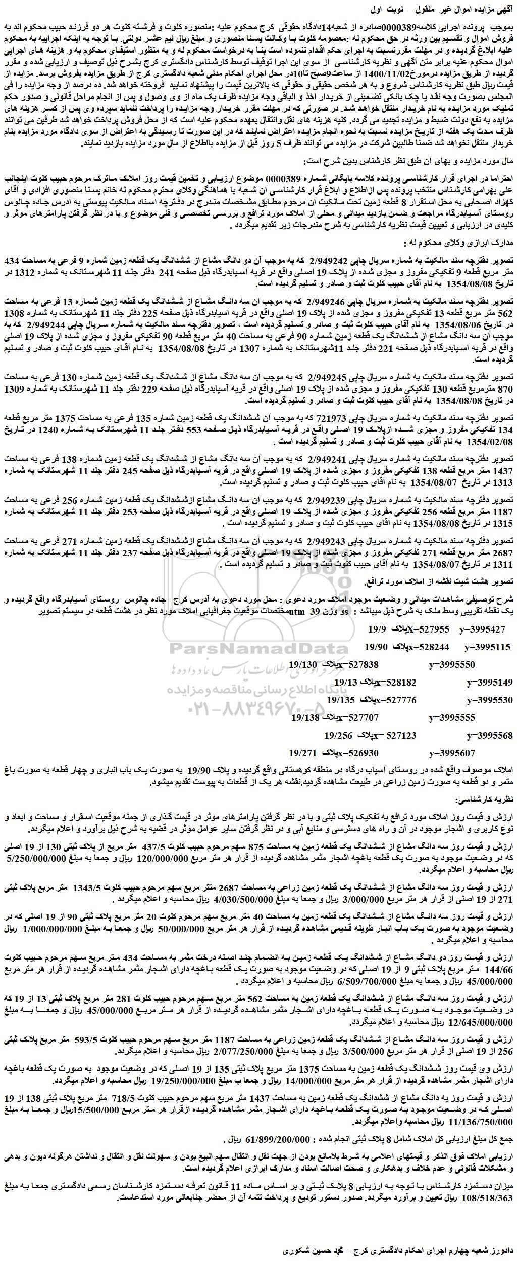 بموجب  پرونده اجرایی کلاسه0000389صادره از شعبه14دادگاه حقوقی  کرج محکوم علیه :منصوره کلوت و فرشته کلوت هر دو فرزند حبیب محکوم اند به فروش اموال و تقسیم بین ورثه در حق محکوم له :معصومه کلوت با وکالت یسنا منصوری و مبلغ ریال نیم عشر دولتی. با توجه به اینکه اجراییه به محکوم علیه ابلاغ گردیده و در مهلت مقررنسبت به اجرای حکم اقدام ننموده است بنا به درخواست محکوم له و به منظور استیفای محکوم به و هزینه های اجرایی اموال محکوم علیه برابر متن آگهی و نظریه کارشناسی  از سوی این اجرا توقیف توسط کارشناس دادگستری کرج بشرح ذیل توصیف و ارزیابی شده و مقرر گردیده از طریق مزایده درمورخ1400/11/02 از ساعت9صبح تا10در محل اجرای احکام مدنی شعبه دادگستری کرج از طریق مزایده بفروش برسد. مزایده از قیمت ریال طبق نظریه کارشناس شروع و به هر شخص حقیقی و حقوقی که بالاترین قیمت را پیشنهاد نمایید  فروخته خواهد شد. ده درصد از وجه مزایده را فی المجلس بصورت وجه نقد یا چک بانکی تضمینی از خریدار اخذ و الباقی وجه مزایده ظرف یک ماه از وی وصول و پس از انجام مراحل قانونی و صدور حکم تملیک مورد مزایده به نام خریدار منتقل خواهد شد. در صورتی که در مهلت مقرر خریدار وجه مزایده را پرداخت ننماید سپرده وی پس از کسر هزینه های مزایده به نفع دولت ضبط و مزایده تجدید می گردد. کلیه هزینه های نقل وانتقال بعهده محکوم علیه است که از محل فروش پرداخت خواهد شد طرفین می توانند ظرف مدت یک هفته از تاریخ مزایده نسبت به نحوه انجام مزایده اعتراض نمایند که در این صورت تا رسیدگی به اعتراض از سوی دادگاه مورد مزایده بنام خریدار منتقل نخواهد شد ضمنا طالبین شرکت در مزایده می توانند ظرف 5 روز قبل از مزایده بااطلاع از مال مورد مزایده بازدید نمایند.