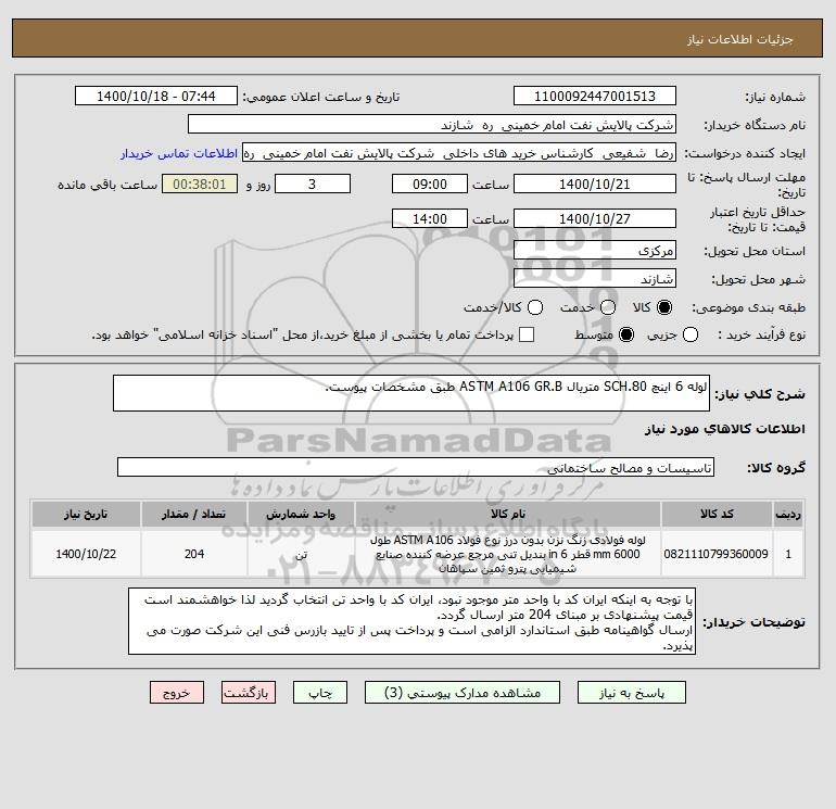 شرح کلی نیاز: لوله 6 اینچ SCH.80 متریال ASTM A106 GR.B طبق مشخصات پیوست.