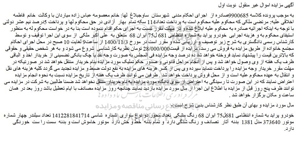 به موجب پرونده کلاسه 9900685صادره از اجرای احکام مدنی شهرستان ساوجبلاغ لها: خانم معصومه عباس زاده میاردان با وکالت خانم فاطمه اخلاقی علیه: مرتضی ملکی که محکوم علیه محکوم است به پرداخت تعداد114 سکه تمام بهار آزادی در حق محکوم لها و پرداخت 5درصد نیم عشر دولتی با توجه به اینکه اجرائیه صادره به محکوم علیه ابلاغ شده و در مهلت مقرر نسبت به اجرای حکم اقدام ننموده است بنا به در خواست محکوم له به منظور استیفای محکوم به و هزینه اجرایی خودرو پراید به شماره انتظامی 681 ل75 ایران 68 متعلق به علی اکبر ملکی از سوی این اجرا توقیف و توسط کارشناس رسمی دادگستری به شرح زیر توصیف و ارزیابی شده و مقرر است در مورخ 1400/11/3 از ساعت9 لغایت 10 صبح در محل اجرای احکام مجتمع خانواده از طریق مزایده به فروش می رسد، مزایده از قیمت28/000/000 تومان نظریه کارشناسی شروع می شود و به هر شخص حقیقی و حقوقی که بالاترین قیمت را پیشنهاد نماید فروخته خواهد شد ده درصد وجه مزایده فی المجلس به صورت وجه نقد یا چک بانکی تضمینی از خریدار اخذ و الباقی ظرف یک هفته از وی وصول خواهد شد و پس از انجام مراحل قانونی و صدور حکم تملیک مورد مزایده بنام خریدار منتقل خواهد شد در صورتیکه در مهلت مقرر خریدار وجه مزایده را پرداخت ننماید سپرده وی پس از کسر هزینه های مزایده به نفع دولت ضبط و مزایده تجدید می گردد کلیه هزینه های نقل و انتقال به عهده محکوم علیه است و از محل فروش پرداخت خواهد شد . طرفین می توانند ظرف یک هفته از تاریخ مزایده نسبت به نحوه انجام مزایده اعتراض نمایند که در این صورت تا رسیدگی به اعتراض از سوی دادگاه مورد مزایده به نام خریدار منتقل نخواهد شد ضمنا طالبین به شرکت در مزایده می توانند ظرف پنج روز قبل از مزایده با اطلاع این اجرا از مال مورد مزایده بازدید نمایند چنانچه روز مزایده مصادف با ایام تعطیل باشد روز بعد در همان ساعت و مکان برگزار خواهد شد .