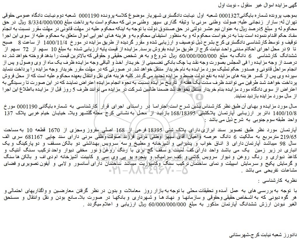 مال مورد مزایده و بهای آن طبق نظر کارشناس بدین شرح است:احتراما در راستای اجرای قرار کارشناسی به شماره بایگانی 0001190 مورخ 1400/10/8 دائر بر ارزیابی آپارتمان پلاکثبتی 168/18395 بازدید از محل به نشانی کرج محله گلشهر ویلا خیایان خیام غربی پلاک 137 واحد طبقه سوم جنوبی به شرح ذیل می باشد :