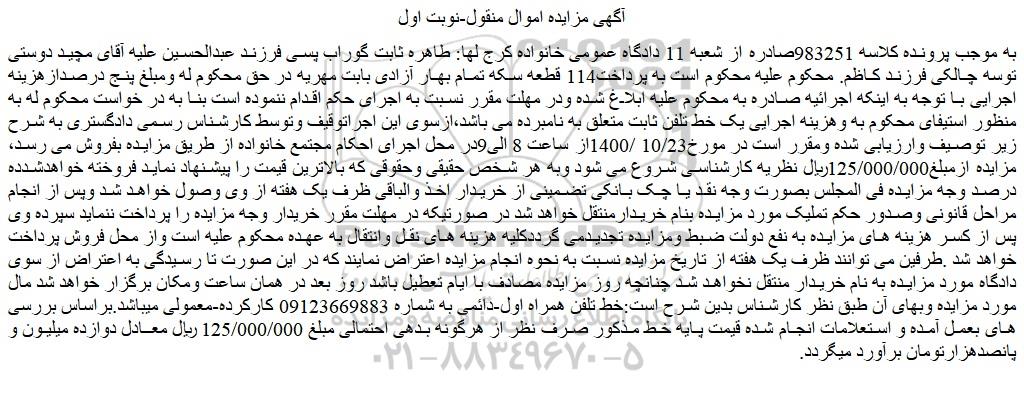 به موجب پرونده کلاسه 983251صادره از شعبه 11 دادگاه عمومی خانواده کرج لها: طاهره ثابت گوراب پسی فرزند عبدالحسین علیه آقای مچید دوستی توسه چالکی فرزند کاظم. محکوم علیه محکوم است به پرداخت114 قطعه سکه تمام بهار آزادی بابت مهریه در حق محکوم له ومبلغ پنج درصدازهزینه اجرایی با توجه به اینکه اجرائیه صادره به محکوم علیه ابلاغ شده ودر مهلت مقرر نسبت به اجرای حکم اقدام ننموده است بنا به در خواست محکوم له به منظور استیفای محکوم به وهزینه اجرایی یک خط تلفن ثابت متعلق به نامبرده می باشد،ازسوی این اجراتوقیف وتوسط کارشناس رسمی دادگستری به شرح زیر توصیف وارزیابی شده ومقرر است در مورخ10/23 /1400از ساعت 8 الی9در محل اجرای احکام مجتمع خانواده از طریق مزایده بفروش می رسد، مزایده ازمبلغ125/000/000ریال نظریه کارشناسی شروع می شود وبه هر شخص حقیقی وحقوقی که بالاترین قیمت را پیشنهاد نماید فروخته خواهدشدده درصد وجه مزایده فی المجلس بصورت وجه نقد یا چک بانکی تضمینی از خریدار اخذ والباقی ظرف یک هفته از وی وصول خواهد شد وپس از انجام مراحل قانونی وصدور حکم تملیک مورد مزایده بنام خریدارمنتقل خواهد شد در صورتیکه در مهلت مقرر خریدار وجه مزایده را پرداخت ننماید سپرده وی پس از کسر هزینه های مزایده به نفع دولت ضبط ومزایده تجدیدمی گرددکلیه هزینه های نقل وانتقال به عهده محکوم علیه است واز محل فروش پرداخت خواهد شد .طرفین می توانند ظرف یک هفته از تاریخ مزایده نسبت به نحوه انجام مزایده اعتراض نمایند که در این صورت تا رسیدگی به اعتراض از سوی دادگاه مورد مزایده به نام خریدار منتقل نخواهد شد چنانچه روز مزایده مصادف با ایام تعطیل باشد روز بعد در همان ساعت ومکان برگزار خواهد شد مال مورد مزایده وبهای آن طبق نظر کارشناس بدین شرح است:خط تلفن همراه اول-دائمی به شماره 09123669883 کارکرده-معمولی میباشد.براساس بررسی های بعمل آمده و استعلامات انجام شده قیمت پایه خط مذکور صرف نظر از هرگونه بدهی احتمالی مبلغ 125/000/000 ریال معادل دوازده میلیون و پانصدهزارتومان برآورد میگردد.