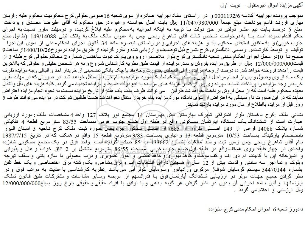 بموجب پرونده اجراییبه  کلاسه 0001192/6 و  در  راستای  مفاد اجراییه  صادره از سوی شعبه 16عمومی حقوقی کرج محکومیت محکوم علیه : قربان بهاری  فرزند  قاسم  بپرداخت  مبلغ  جمعاً  11/047/980/000  ریال  بابت  اصل  خواسته  و غیره در حق  محکوم  له  آقای  علیرضا  مصدق  و پرداخت  مبلغ  5  درصد بابت  نیم  عشر  دولتی  در  حق  دولت  با  توجه  به  اینکه  اجراییه  به محکوم  علیه  ابلاغ  گردیده  و  درمهلت  مقرر  نسبت به  اجرای حکم  اقدام ننموده  است  بنا  به درخواست  شخص  ثالث  اقای  شاهرخ  رنجی  چمن  به  عنوان  مالک  ملک به  پلاک  ثبتی  149/14088  (ط اول ضلع جنوب غربی) و  به منظور استیفای  محکوم  به  و  هزینه های  اجرایی و در راستای  تبصره  ماده  34  قانون  اجرای  احکام مدنی  از  سوی  این اجرا    توقیف  و  توسط  کارشناس  رسمی  دادگستری کرج بشرح ذیل توصیف و ارزیابی شده و مقرر گردیده از طریق مزایده درمورخ1400/10/26از ساعت9 صبح تا  10در محل اجرای احکام مدنی شعبه دادگستری کرج بلوار ملاصدرا روبروی پارک نبوت ساختمان شماره 2 محاکم حقوقی کرج طبقه 3 از قیمت12/000/000/000  ریال  از طریق مزایده بفروش برسد. مزایده از قیمت طبق نظریه کارشناس شروع و به هر شخص حقیقی و حقوقی که بالاترین قیمت را بدهد فروخته خواهد شد. ده درصد از وجه مزایده را فی المجلس بصورت وجه نقد یا چک بانکی تضمینی از خریدار اخذ و الباقی وجه مزایده ظرف یک ماه از وی وصول و پس از انجام مراحل قانونی و صدور حکم تملیک مورد مزایده به نام خریدار منتقل خواهد شد. در صورتی که در مهلت مقرر خریدار وجه مزایده را پرداخت ننماید سپرده وی پس از کسر هزینه های مزایده به نفع دولت ضبط و مزایده تجدید می گردد. کلیه هزینه های نقل وانتقال بعهده محکوم علیه است که از محل فروش پرداخت خواهد شد طرفین    می توانند ظرف مدت یک هفته از تاریخ مزایده نسبت به نحوه انجام مزایده اعتراض نمایند که در این صورت تا رسیدگی به اعتراض از سوی دادگاه مورد مزایده بنام خریدار منتقل نخواهد شد ضمنا طالبین شرکت در مزایده می توانند ظرف 5 روز قبل از مزایده بااطلاع از مال مورد مزایده بازدید نمایند.