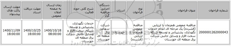 | 2000001262000043 | مناقصه عمومی همزمان با ارزیابی (فشرده) یک مرحله ای انجام خدمات نگهداری، پشتیبانی و توسعه شبکه، سخت افزار و وسایل جانبی شرکت برق منطقه ای خوزستان | مناقصه عمومی همزمان با ارزیابی (فشرده) | خوزستان | شرکت سهامی برق منطقه ای خوزستان | خدمات نگهداری، پشتیبانی و توسعه شبکه، سخت افزار و وسایل جانبی شرکت برق منطقه ای خوزستان | 1400/10/18 08:00:00 | 1400/10/25 18:00:00 | 1400/11/09 18:00:00 |