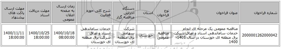 | 2000001262000042 | مناقصه عمومی یک مرحله ای انجام خدمات ساماندهی اسناد و اوراق شرکت برق منطقه ای خوزستان در سال 1401-1400 | مناقصه عمومی | خوزستان | شرکت سهامی برق منطقه ای خوزستان | خدمات ساماندهی اسناد و اوراق شرکت برق منطقه ای خوزستان | 1400/10/18 08:00:00 | 1400/10/25 18:00:00 | 1400/11/11 18:00:00 |