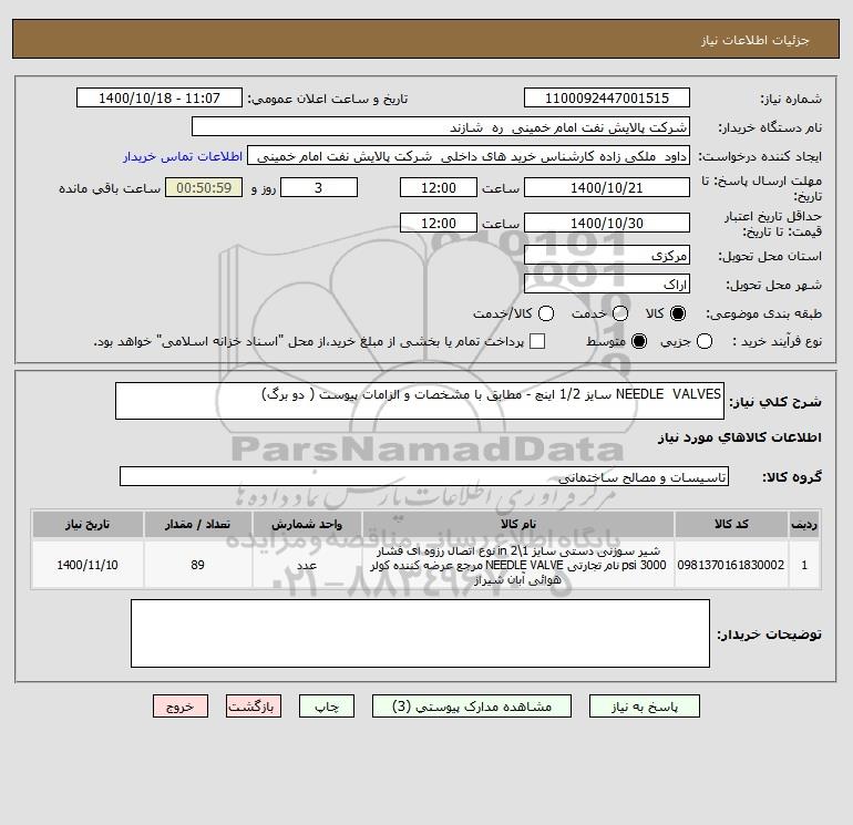 شرح کلی نیاز: NEEDLE VALVES سایز 1/2 اینچ - مطابق با مشخصات و الزامات پیوست ( دو برگ)