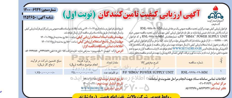 شرکت پالایش نفت امام خمینی (ره) شازند در نظر دارد فراخوان ارزیابی کیفی جهت برگزاری تجدید مناقصه عمومی خرید P/F HIMA POWER SUPPLY UNIT به شماره RNL-9948029-MM و شماره فراخوان 2000092447000169 را از طریق سامانه تدارکات الکترونیکی دولت برگزار نماید. کلیه مراحل برگزاری فراخوان ارزیابی کیفی از دریافت و تحویل اسناد استعلام ارزیابی کیفی تا ارسال دعوتنامه جهت سایر مراحل مناقصه از طریق درگاه سامانه تدارکات الکترونیکی دولت ستاد به آدرس ستاد ایران انجام خواهد شد. لازم است مناقصه گران در صورت عدم عضویت قبلی مراحل ثبت نام در سایت مذکور و دریافت گواهی امضای الکترونیکی را جهت شرکت در مناقصه محقق سازند. تاریخ انتشار فراخوان در سامانه تاریخ 400.10.21 می باشد. اطلاعات و اسناد مناقصه عمومی پس از برگزاری فرآیند ارزیابی کیفی و ارسال دعوتنامه از طریق سامانه ستاد به مناقصه گران ارسال خواهد شد.