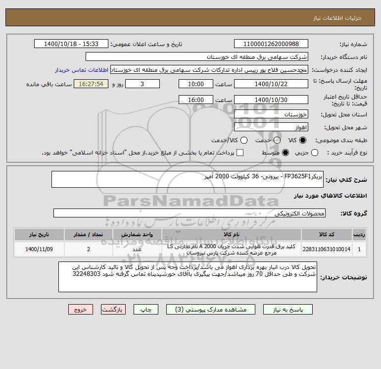 شرح کلی نیاز: بریکرFP3625F1 - بیرونی- 36 کیلوولت 2000 آمپر