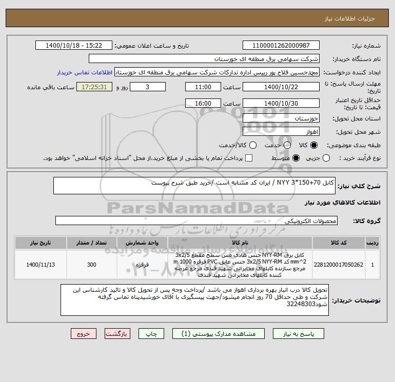 شرح کلی نیاز: کابل NYY 3*150+70 / ایران کد مشابه است /خرید طبق شرح پیوست