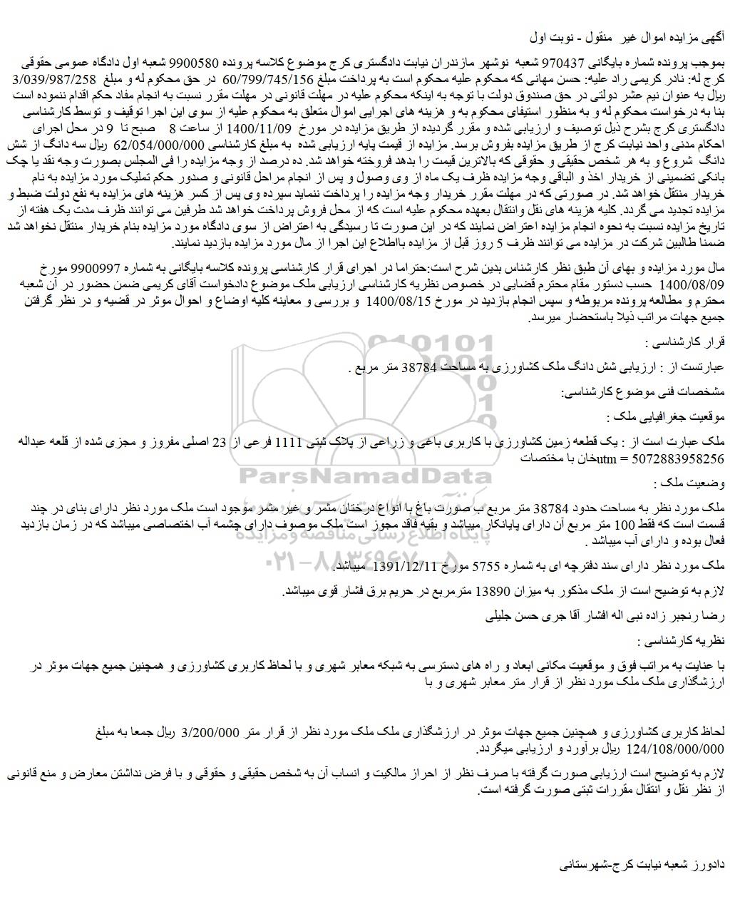 بموجب پرونده شماره بایگانی 970437 شعبه نوشهر مازندران نیابت دادگستری کرج موضوع کلاسه پرونده 9900580 شعبه اول دادگاه عمومی حقوقی کرج له: نادر کریمی راد علیه: حسن مهانی که محکوم علیه محکوم است به پرداخت مبلغ 60/799/745/156 در حق محکوم له و مبلغ 3/039/987/258 ریال به عنوان نیم عشر دولتی در حق صندوق دولت با توجه به اینکه محکوم علیه در مهلت قانونی در مهلت مقرر نسبت به انجام مفاد حکم اقدام ننموده است بنا به درخواست محکوم له و به منظور استیفای محکوم به و هزینه های اجرایی اموال متعلق به محکوم علیه از سوی این اجرا توقیف و توسط کارشناسی دادگستری کرج بشرح ذیل توصیف و ارزیابی شده و مقرر گردیده از طریق مزایده در مورخ 1400/11/09 از ساعت 8 صبح تا 9 در محل اجرای احکام مدنی واحد نیابت کرج از طریق مزایده بفروش برسد. مزایده از قیمت پایه ارزیابی شده به مبلغ کارشناسی 62/054/000/000 ریال سه دانگ از شش دانگ شروع و به هر شخص حقیقی و حقوقی که بالاترین قیمت را بدهد فروخته خواهد شد. ده درصد از وجه مزایده را فی المجلس بصورت وجه نقد یا چک بانکی تضمینی از خریدار اخذ و الباقی وجه مزایده ظرف یک ماه از وی وصول و پس از انجام مراحل قانونی و صدور حکم تملیک مورد مزایده به نام خریدار منتقل خواهد شد. در صورتی که در مهلت مقرر خریدار وجه مزایده را پرداخت ننماید سپرده وی پس از کسر هزینه های مزایده به نفع دولت ضبط و مزایده تجدید می گردد. کلیه هزینه های نقل وانتقال بعهده محکوم علیه است که از محل فروش پرداخت خواهد شد طرفین می توانند ظرف مدت یک هفته از تاریخ مزایده نسبت به نحوه انجام مزایده اعتراض نمایند که در این صورت تا رسیدگی به اعتراض از سوی دادگاه مورد مزایده بنام خریدار منتقل نخواهد شد ضمنا طالبین شرکت در مزایده می توانند ظرف 5 روز قبل از مزایده بااطلاع این اجرا از مال مورد مزایده بازدید نمایند.