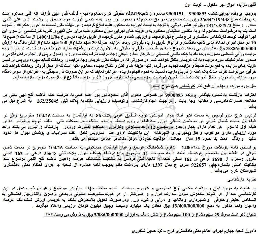 بموجب پرونده اجرایی کلاسه 9900893 – 9900151 صادره از شعبه15دادگاه حقوقی کرج محکوم علیه : فاطمه فتح الهی فرزند اله قلی محکوم است به پرداخت مبلغ 3/634/719/435 ریال بابت محکوم به در حق محکوم له : محمود نور پور همه کسی فرزند مراد حاصل با وکالت آقای علی فتحی سعدی و مبلغ 181/735/972 ریال نیم عشر دولتی. با توجه به اینکه اجراییه به محکوم علیه ابلاغ گردیده و در مهلت مقررنسبت به اجرای حکم اقدام ننموده است بنا به درخواست محکوم له و به منظور استیفای محکوم به و هزینه های اجرایی اموال محکوم علیه برابر متن آگهی و نظریه کارشناسی از سوی این اجرا توقیف توسط کارشناس دادگستری کرج بشرح ذیل توصیف و ارزیابی شده و مقرر گردیده از طریق مزایده درمورخ 1400/11/04 از ساعت 9 صبح تا 10 در محل اجرای احکام مدنی شعبه دادگستری کرج از طریق مزایده بفروش برسد. مزایده صرفا 29 سهم مشاع از 100 سهم مشاع از شش دانگ به ارزش 3/886/000/000 ریال به فروش می رسد/. شروع و به هر شخص حقیقی و حقوقی که بالاترین قیمت را پیشنهاد نمایید فروخته خواهد شد. ده درصد از وجه مزایده را فی المجلس بصورت وجه نقد یا چک بانکی تضمینی از خریدار اخذ و الباقی وجه مزایده ظرف یک ماه از وی وصول و پس از انجام مراحل قانونی و صدور حکم تملیک مورد مزایده به نام خریدار منتقل خواهد شد. در صورتی که در مهلت مقرر خریدار وجه مزایده را پرداخت ننماید سپرده وی پس از کسر هزینه های مزایده به نفع دولت ضبط و مزایده تجدید می گردد. کلیه هزینه های نقل وانتقال بعهده محکوم علیه است که از محل فروش پرداخت خواهد شد طرفین می توانند ظرف مدت یک هفته از تاریخ مزایده نسبت به نحوه انجام مزایده اعتراض نمایند که در این صورت تا رسیدگی به اعتراض از سوی دادگاه مورد مزایده بنام خریدار منتقل نخواهد شد ضمنا طالبین شرکت در مزایده می توانند ظرف 5 روز قبل از مزایده بااطلاع از مال مورد مزایده بازدید نمایند.