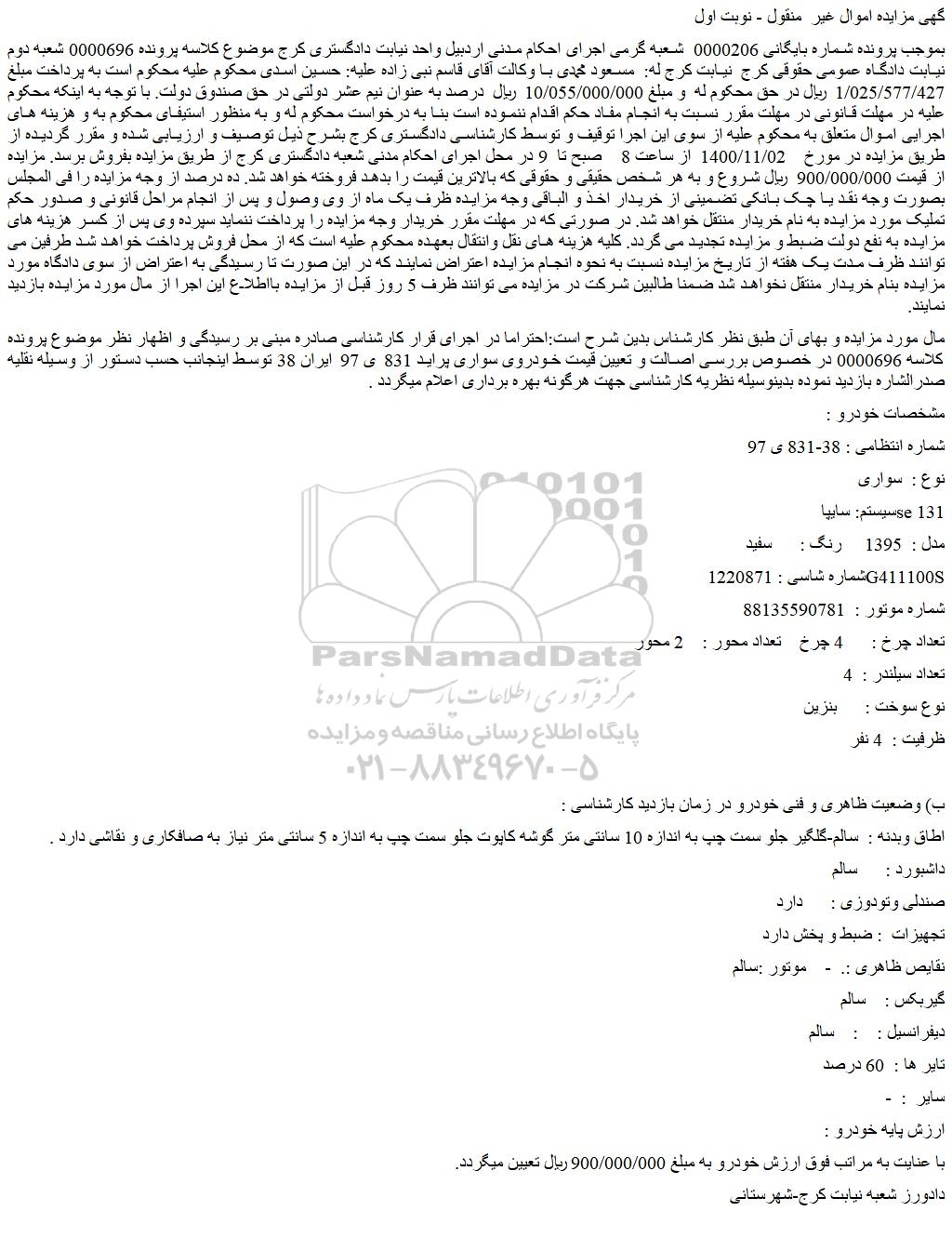 مال مورد مزایده و بهای آن طبق نظر کارشناس بدین شرح است:احتراما در اجرای قرار کارشناسی صادره مبنی بر رسیدگی و اظهار نظر موضوع پرونده کلاسه 0000696 در خصوص بررسی اصالت و تعیین قیمت خودروی سواری پراید 831 ی 97 ایران 38 توسط اینجانب حسب دستور از وسیله نقلیه صدرالشاره بازدید نموده بدینوسیله نظریه کارشناسی جهت هرگونه بهره برداری اعلام میگردد .