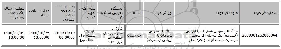 | 2000001262000044 | مناقصه عمومی همزمان با ارزیابی (فشرده) یک مرحله ای مرمت و بازسازی پست لوشاتو خرمشهر | مناقصه عمومی همزمان با ارزیابی (فشرده) | خوزستان | شرکت سهامی برق منطقه ای خوزستان | پایداری شبکه برق انتقال نیرو | 1400/10/19 08:00:00 | 1400/10/25 18:00:00 | 1400/11/09 18:00:00 |