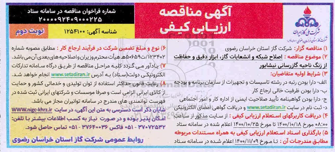 مناقصه ارزیابی کیفی اصلاح شبکه و انشعابات گاز، ابزار دقیق و حفاظت از زنگ ناحیه گازرسانی- نوبت دوم , مناقصه ارزیابی کیفی اصلاح شبکه و انشعابات گاز، ابزار دقیق و حفاظت از زنگ ناحیه گازرسانی