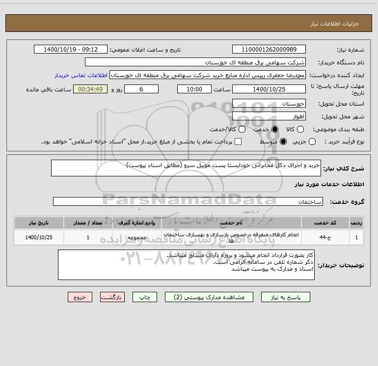 شرح کلی نیاز: خرید و اجرای دکل مخابراتی خودایستا پست موبیل سرو (مطابق اسناد پیوست)