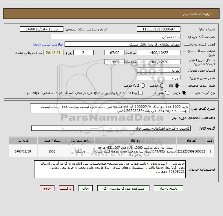 شرح کلی نیاز: خرید 1600 عدد پاور بانک 10000M/A کد کالا مشابه می باشد طبق لیست پیوست عدم ارسال لیست پیوست به منزله حذف می باشد26205036 فکس