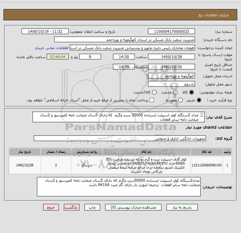 شرح کلی نیاز: عداد 2ستگاه کولر اسپیلت ایستاده 55000 سرد وگرم که دارای 5سال ضمانت نامه کمپرسور و 2سال ضمانت نامه سایر قطعات