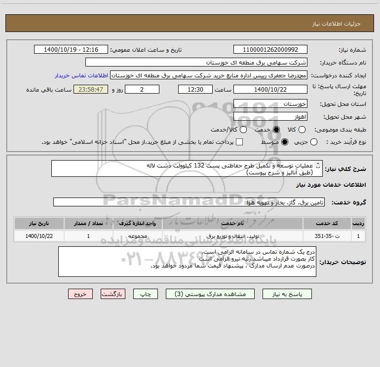 شرح کلی نیاز: عملیات توسعه و تکمیل طرح حفاظتی پست 132 کیلوولت دشت لاله