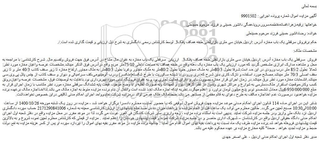 آگهی مزایده اموال شماره پرونده اجرایی : 9901502