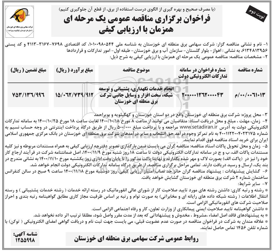 | 00/0061013/م | 2000001262000043 | انجام خدمات نگهداری، پشتیبانی و توسعه شبکه، سخت افزار و وسایل جانبی شرکت برق منطقه ای خوزستان | 15.062.739.912 | 753.136.996 |
