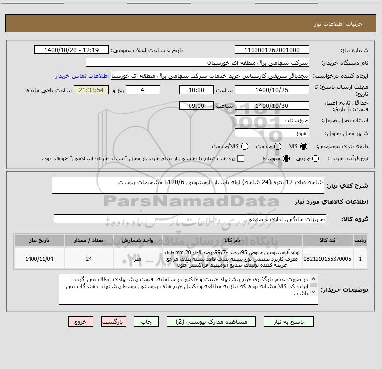 شرح کلی نیاز: شاخه های 12 متری(24 شاخه) لوله باسبار آلومینیومی 120/6با مشخصات پیوست