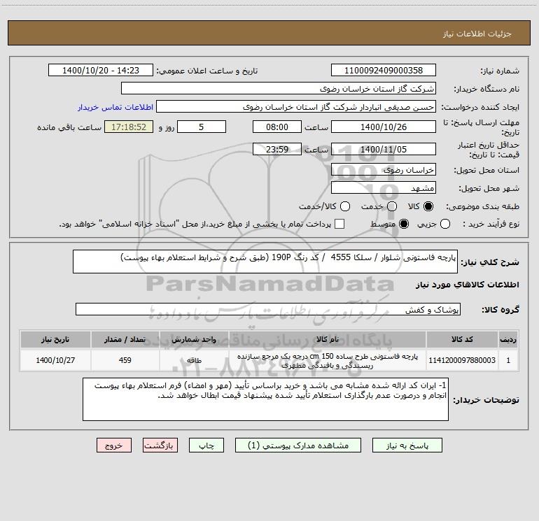 استعلام پارچه فاستونی شلوار / سلکا 4555 / کد رنگ 190P (طبق شرح و شرایط استعلام بهاء پیوست), استعلام پارچه فاستونی شلوار / سلکا 4555 / کد رنگ 190P (طبق شرح و شرایط استعلام بهاء پیوست)