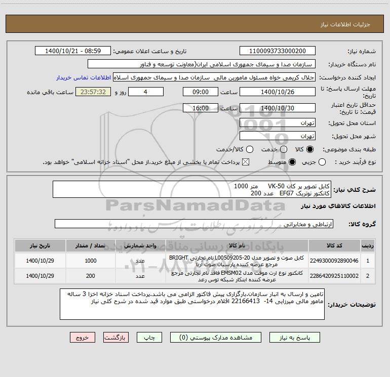 شرح کلی نیاز: کابل تصویر پر کان VK-50 متر 1000