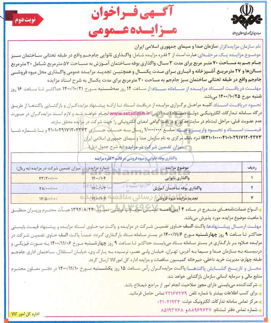 مزایده یک مرحله ای : عبارت است 3 فقره مزایده شامل: واگذاری نانوایی جام جم واقع در طبقه تحتانی ساختمان سبز جام جم به مساحت 70 متر مربع برای مدت سه سال، واگذاری ساختمان آموزش به مساحت 57 متر مربع شامل 30 متر مربع سالن ها و 27 متر مربع آشپزخانه و انباری برای مدت یک سال و همچنین تجدید مزایده عمومی واگذاری محل میوه فروشی جام جم واقع در طبقه تحتانی ساختمان سبز جام جم به مساحت 30 متر مربع برای مدت یک سال به شرح اسناد مزایده