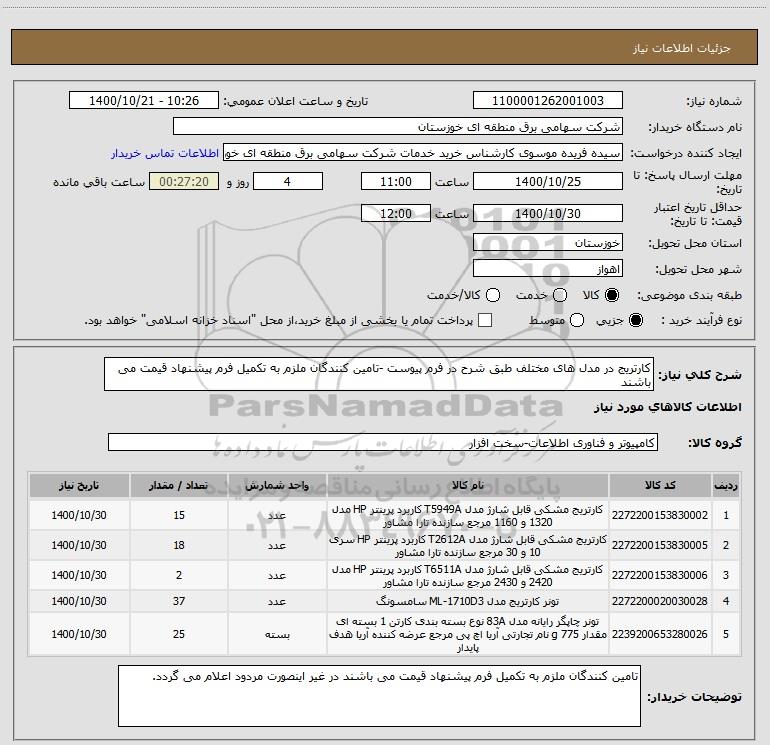 شرح کلی نیاز: کارتریج در مدل های مختلف طبق شرح در فرم پیوست -تامین کنندگان ملزم به تکمیل فرم پیشنهاد قیمت می باشند