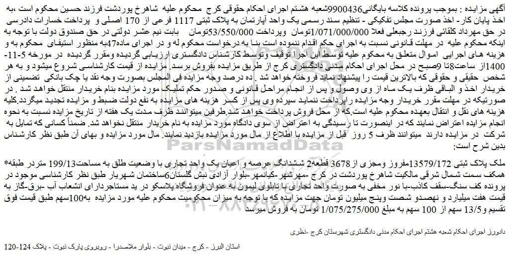 *ملک پلاک ثبتی 13579/172مفروز ومجزی از3678 قطعه2 ششدانگ عرصه و اعیان یک واحد تجاری با وضعیت طلق به مساحت199/13 متردر طبقه همکف سمت شمال شرقی مالکیت شاهرخ پوردشت در کرج -مهرشهر-کیانمهر-بلوار آزادی نبش گلستان6ساختمان شهریار طبق نظر کارشناسی موجود در پرونده کف سنگ-سقف کاذب-با نور مخفی به صورت واحد تجاری با تابلوی لیمون به عنوان فروشگاه پلاسکو در ید مستاجردارای انشعاب آب -برق-گاز به قیمت هفت میلیارد و نهصدو شصت وپنج میلیون تومان جهت مزایده که با توجه به میزان محکومیت محکوم علیه مورد مزایده به100سهم طبق قیمت فوق تقسیم و13/5 سهم از 100 سهم به مبلغ 1/075/275/000 تومان به فروش میرسد