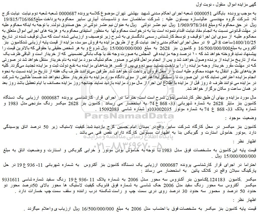 مال مورد مزایده و بهای آن طبق نظر کارشناسی بدون شرح است است: حتراما در اجرای قرار کارشناسی پرونده 0000687 ارزیابی یک دستگاه کامیون بنز مایلر 2628 به شماره شهربانی 33- 868 ع 74 به استحضار می رساند : کامیون بنز 2628 میکسر رنگ مترنجی مدل 1983 و شماره پلاک 33- 868 ع 74 به شماره موتور 103002035و شماره شاسی 15092083 .