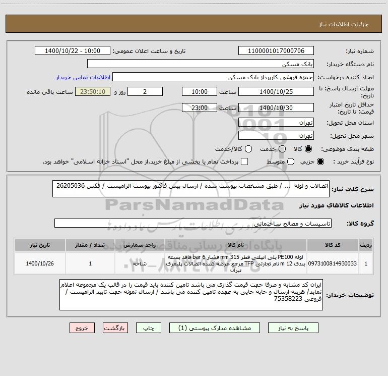 شرح کلی نیاز: اتصالات و لوله ... / طبق مشخصات پیوست شده / ارسال پیش فاکتور پیوست الزامیست / فکس 26205036