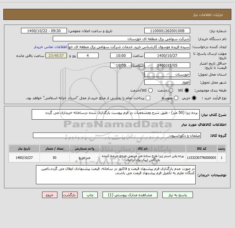 استعلام پرده زبرا (50 متر) - طبق شرح ومشخصات در فرم پیوست بارگذاری شده درسامانه خریداری می گردد, استعلام پرده زبرا (50 متر) - طبق شرح ومشخصات در فرم پیوست بارگذاری شده درسامانه خریداری می گردد