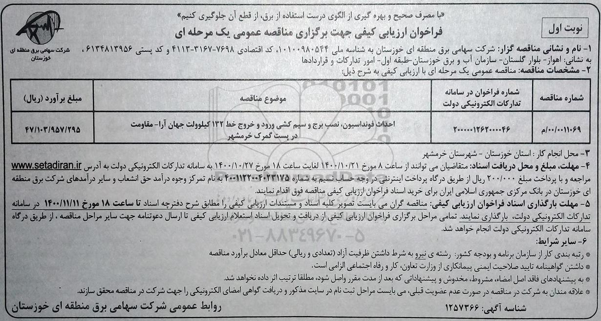 00/0011069/م   2000001262000046 احداث، فوندانسیون، نصب و برج و سیم کشی ورود و خروج خط 132 کیلوولت جهان ارا، مقاوت در پست گمرک خرمشهر  47.103.957.295