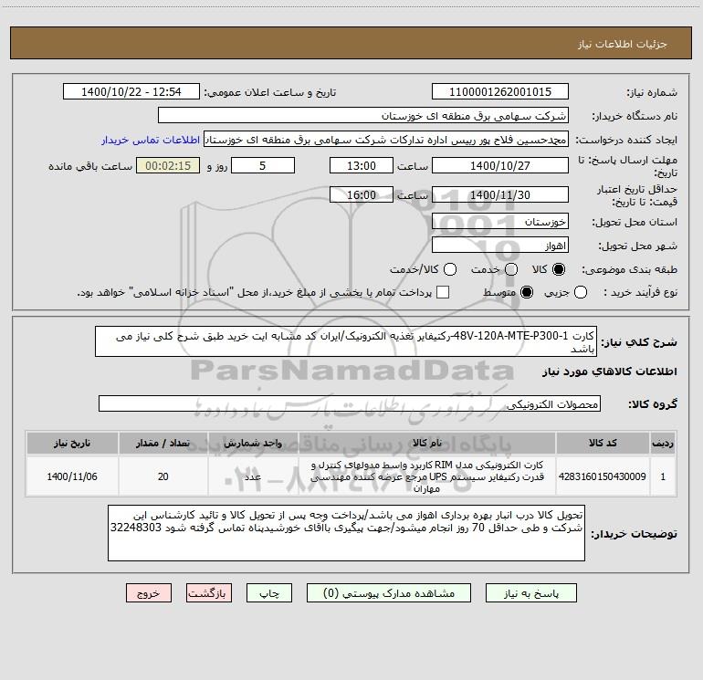 شرح کلی نیاز: کارت 48V-120A-MTE-P300-1-رکتیفایر تغذیه الکترونیک/ایران کد مشابه ایت خرید طبق شرح کلی نیاز می باشد