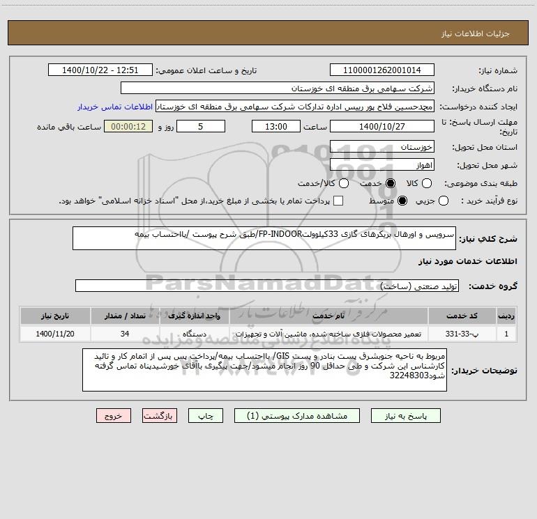 شرح کلی نیاز: سرویس و اورهال بریکرهای گازی 33کیلوولتFP-INDOOR/طبق شرح پیوست /بااحتساب بیمه