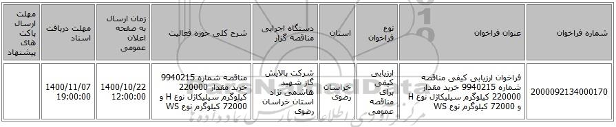 | 2000092134000170 | فراخوان ارزیابی کیفی مناقصه شماره 9940215 خرید مقدار 220000 کیلوگرم سیلیکاژل نوع H و 72000 کیلوگرم نوع WS | ارزیابی کیفی برای مناقصه عمومی | خراسان رضوی | شرکت پالایش گاز شهید هاشمی نژاد استان خراسان رضوی | مناقصه شماره 9940215 خرید مقدار 220000 کیلوگرم سیلیکاژل نوع H و 72000 کیلوگرم نوع WS | 1400/10/22 12:00:00 | 1400/11/07 19:00:00 |