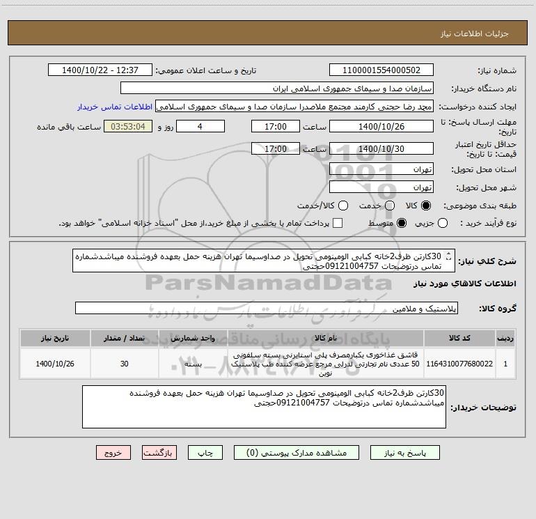 شرح کلی نیاز: 30کارتن ظرف2خانه کبابی الومینومی تحویل در صداوسیما تهران هزینه حمل بعهده فروشنده میباشدشماره تماس درتوضیحات 09121004757حجتی